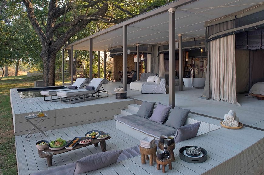 Todas as suites têm um caminho que leva até às zonas comuns que incluem: uma sala de jantar, biblioteca, três piscinas e um deck. Locais de sonho para relaxar depois de um dia de safari e aventura pelo parque situado mesmo ali ao lado.
