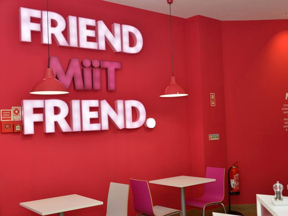 Foi por isso com uma profunda satisfação que encontrei esta promoção fantástica do Sapo: dois menus no novo restaurante Miit (qualquer semelhança com os Meet organizados pelo Facebook é pura coincidência) por 50% do valor. E o que é que isso quer dizer em números? Um almoço com prato e bebida por 3,37 euros. Meus senhores, isto são preços que não se praticam desde que os homens usavam patilhas até ao queixo. Por isso, peguei em dois elementos da minha equipa de futsal e fui até ao Colombo depois de uma manhã de aulas. Eles pediram um menu Miit Burger, eu pedi um menu bife de alcatara (que não estava incluído na promoção).
