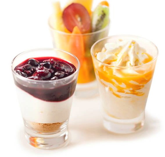 Todas as sobremsesas são servidas em pequenos copos de shot. E há três opções: shot de cheesecake de frutos do bosque, shot de mousse de chocolate branco e maracujá ou shot de frutas frescas.