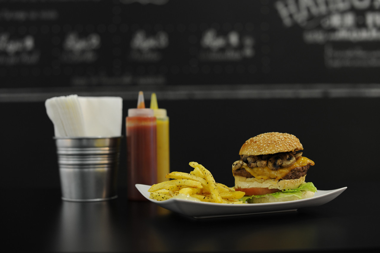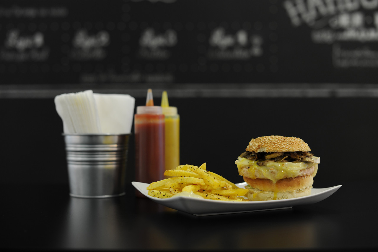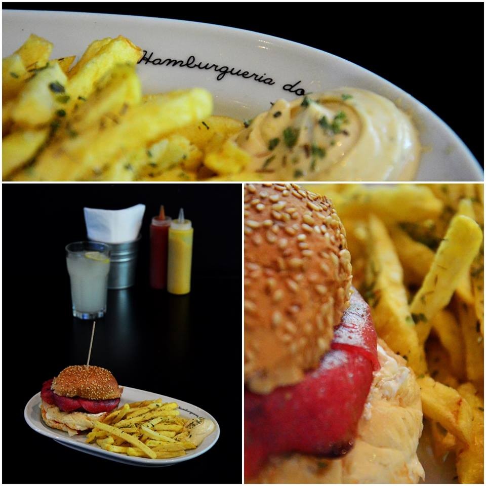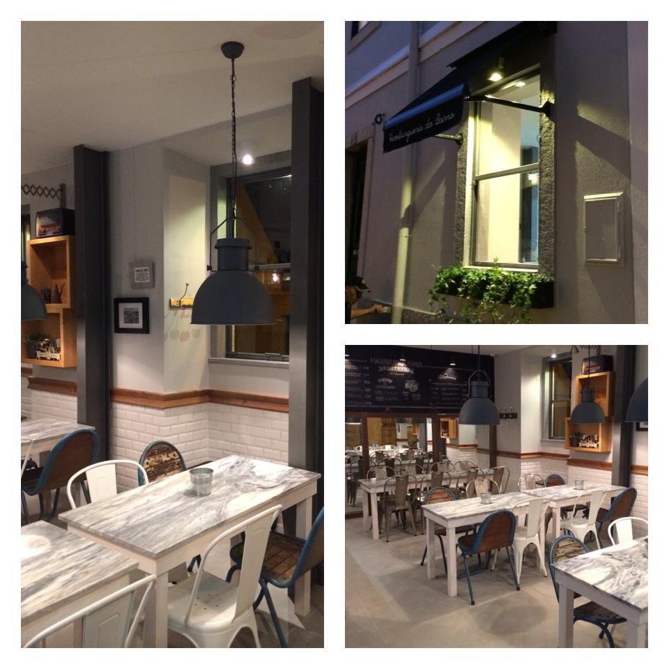 Não é difícil ter uma reacção destas quando se entra na Hamburgueria. O espaço não pode ser mais simpático, agradável e divertido. Decorado com bom gosto, o restaurante tem pormenores deliciosos: os tampos das mesas são em pedra como na antiga cozinha da minha bisavó Quitéria, as cadeiras são rústicas e diferentes umas das outras, as paredes são de ardósia com a ementa escrita a giz, e a música é um discreto som de jazz. Todo o ambiente é um enorme convite a entrar. E, ainda por cima, nem sequer é barulhento.